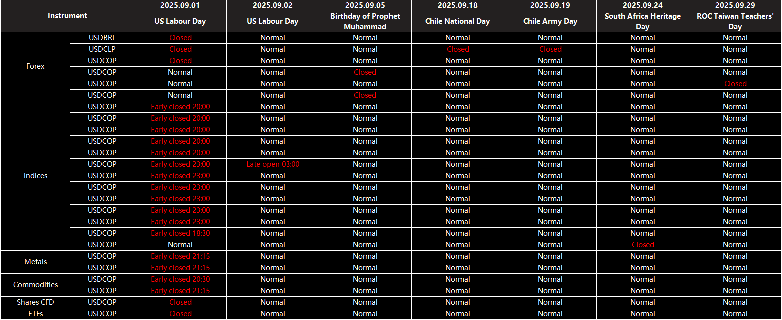 Please be advised that the following instruments’ trading hours and market session times will be affected by the September holidays.